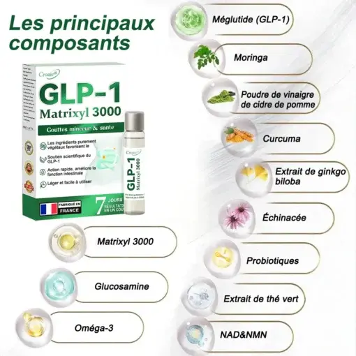 CROAIE® Gouttes Minceur & Santé GLP-1 & Matrixyl 3000 ont été développées par une équipe de plus de 30 experts internationaux en endocrinologie et diabétologie après plus de 3 ans de recherche. Elles combinent le tirzépatide avec de puissants ingrédients végétaux pour stimuler le métabolisme, accélérer la combustion des graisses et soutenir la santé digestive ainsi que lymphatique. Cette solution orale a été approuvée par l’ANSM (Agence nationale de sécurité du médicament et des produits de santé) pour sa sécurité et son efficacité, offrant une solution scientifiquement fondée pour la perte de poids et le bien-être global.