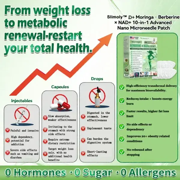 ย Slimolyโข ๐ด๐๐๐๐๐๐ฎ ยท ๐๐ฒ๐ฟ๐ฏ๐ฒ๐ฟ๐๐ฃ๐ ร ๐๐ผ๐+ ๐๐-๐ข๐ง-๐ ๐๐ฑ๐๐ฎ๐ป๐ฐ๐๐ ๐๐๐ฃ๐ค ๐๐๐๐ง๐ค๐ฃ๐๐๐๐ฅ๐ ๐๐๐ญ๐๐ ย was developed through more than 20 years of research by a multidisciplinary team of over 30 experts. Each patch incorporates an ultra-fine microneedle architecture measuring approximately one-seventh the thickness of a human hair, designed to ensure a smooth and virtually painless application. The formulation contains highly concentrated natural bioactive compounds, up to 20-fold higher than conventional market levels, including Moringa and Berberine, which act synergistically to support healthy glycemic responses, appetite regulation, and lipid metabolism, thereby promoting gradual and sustainable weight management. Enriched with NAD+, the patch further supports skin firmness and structural resilience during body-weight fluctuations, helping maintain a lean appearance without compromising comfort or aesthetics. Additional high-efficacy components contribute to the support of immune function, digestive health, gut balance, womenโs health, daily energy levels, and fatigue reduction, collectively promoting a more youthful and resilient physiological state from within. Manufactured in GMP-certified facilities that comply with both U.S. and EU quality standards, this needle-free, science-driven solution provides a safe and comprehensive approach to effective weight management and long-term metabolic health, designed to work in harmony with the body rather than against it.